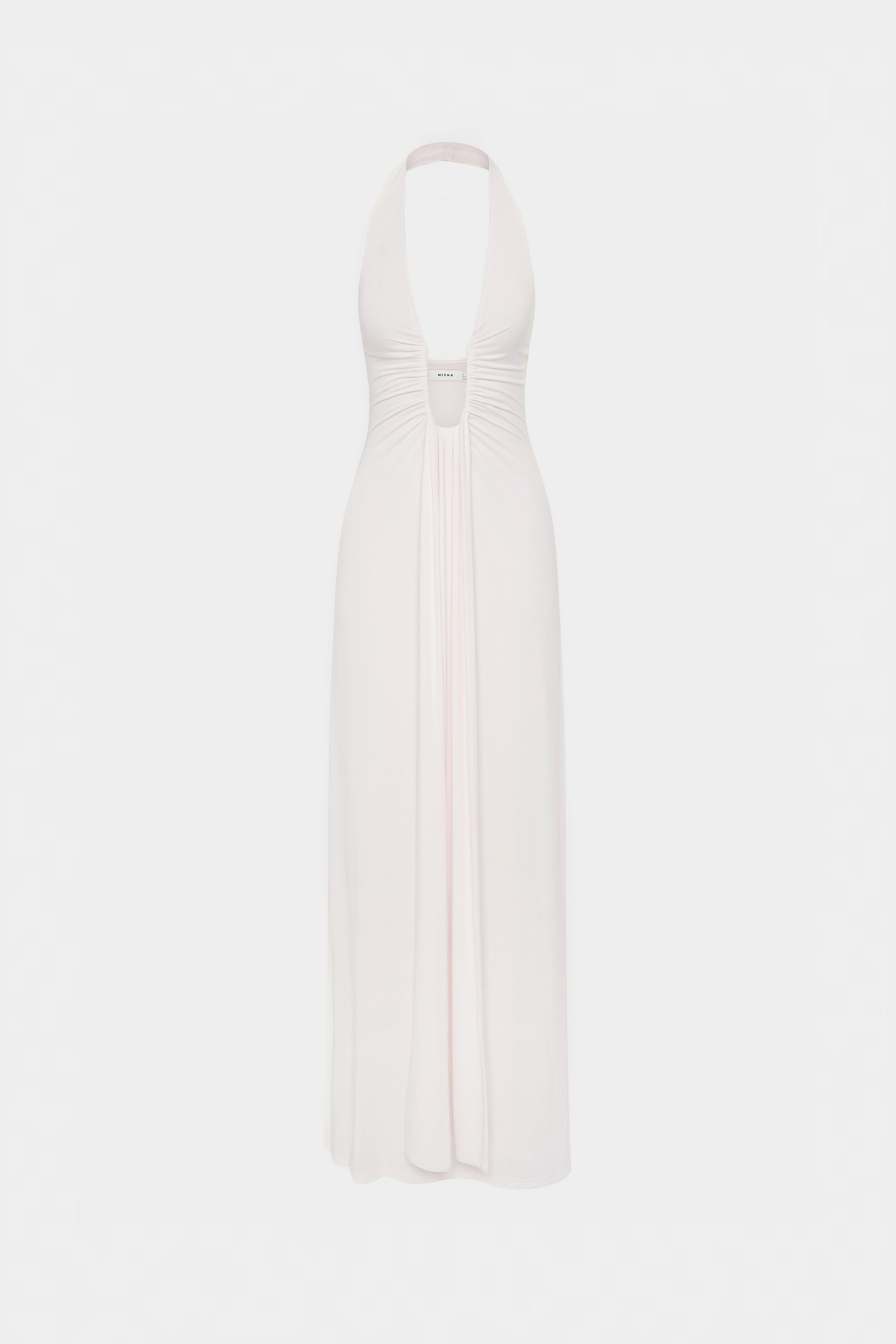 Lăsați-vă seduși de farmecul natural și fluid al acestei rochii ivoire. Țesătura sa din cupro ușor se conturează pe forme cu grație, în timp ce decolteul său adânc și drapajele subtile adaugă o notă dramatică perfectă de la zi la seară.