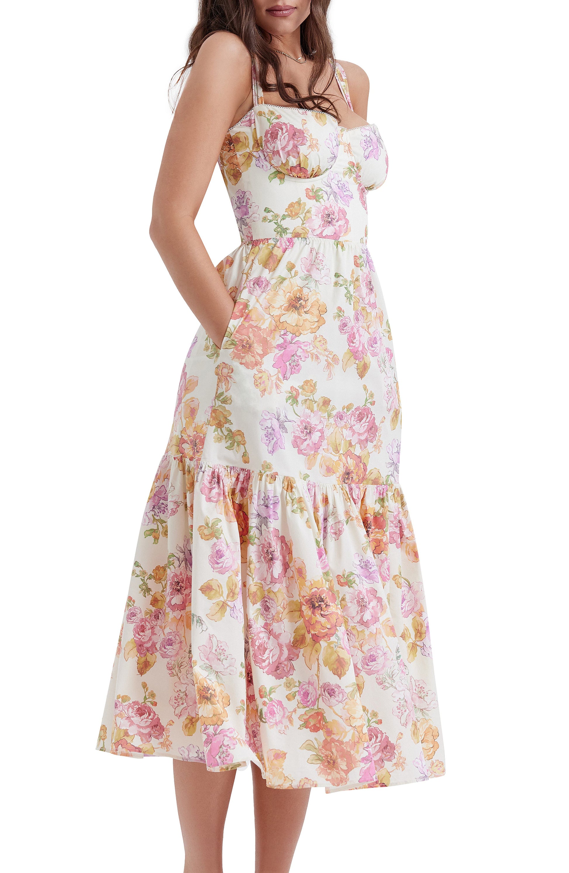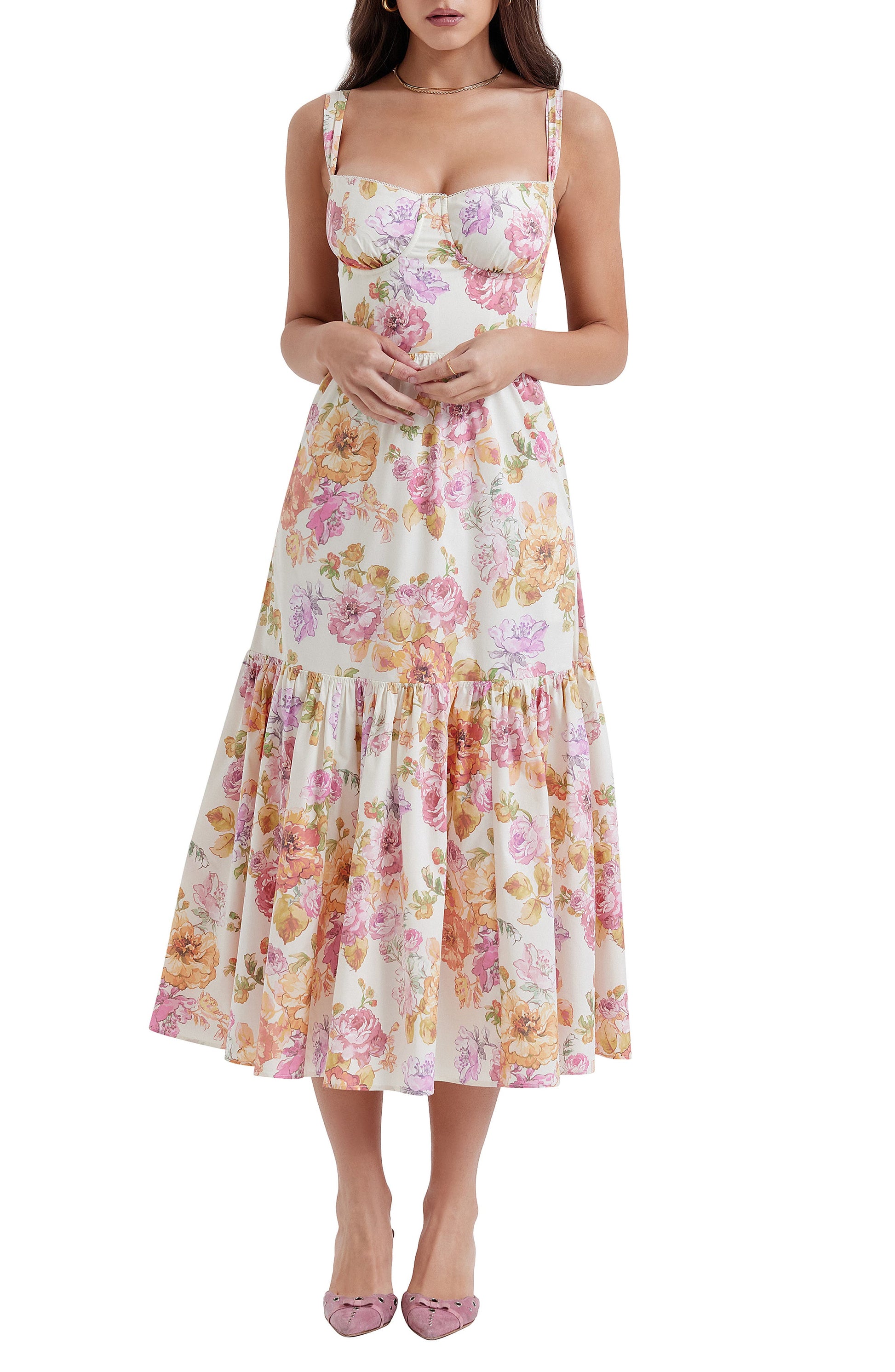 Împrospătează-ți stilul de petrecere în grădină cu o rochie de vară romantică, decorată cu flori, dotată cu cupe în stil corset, bretele ajustabile și o fustă completă cu volane.