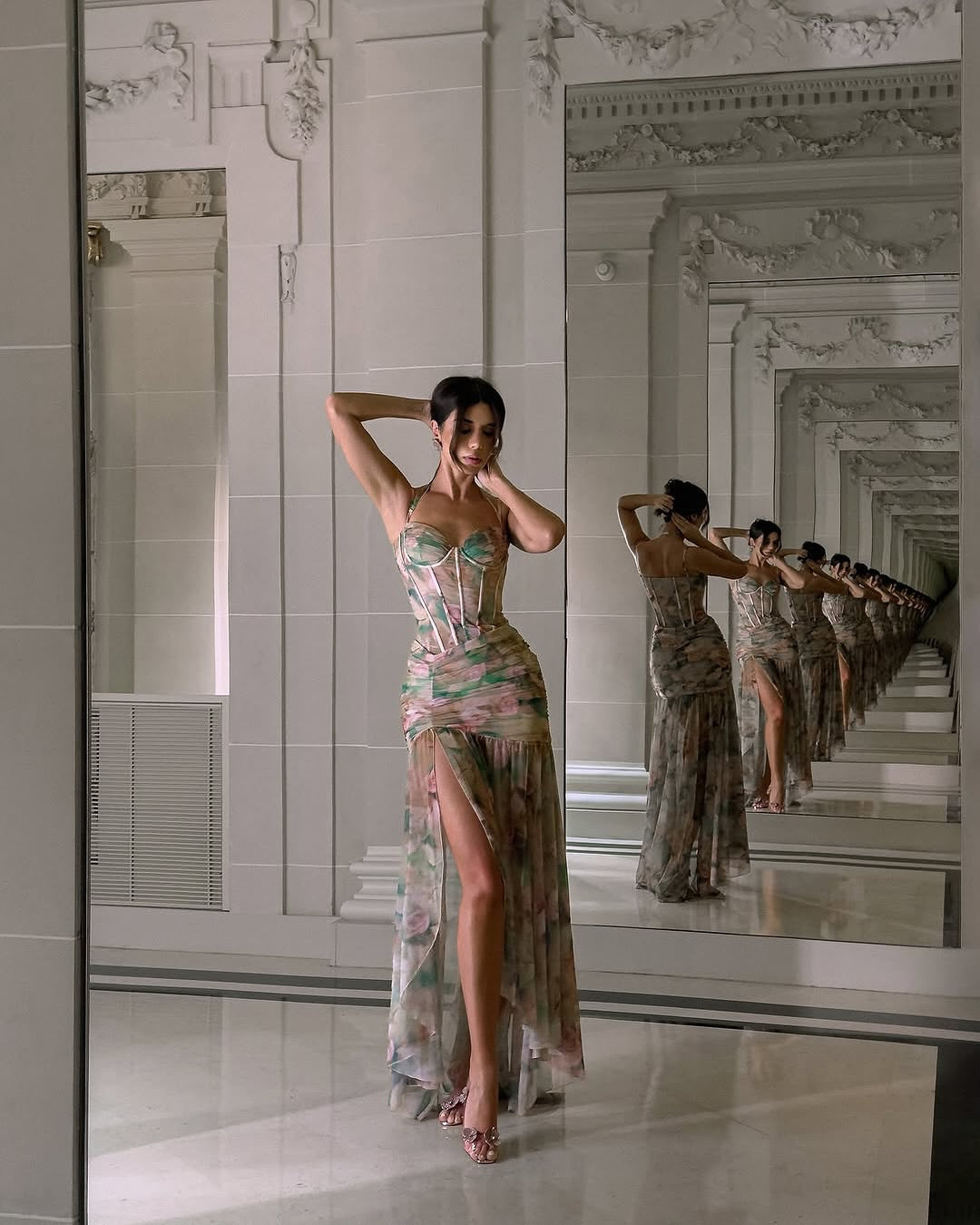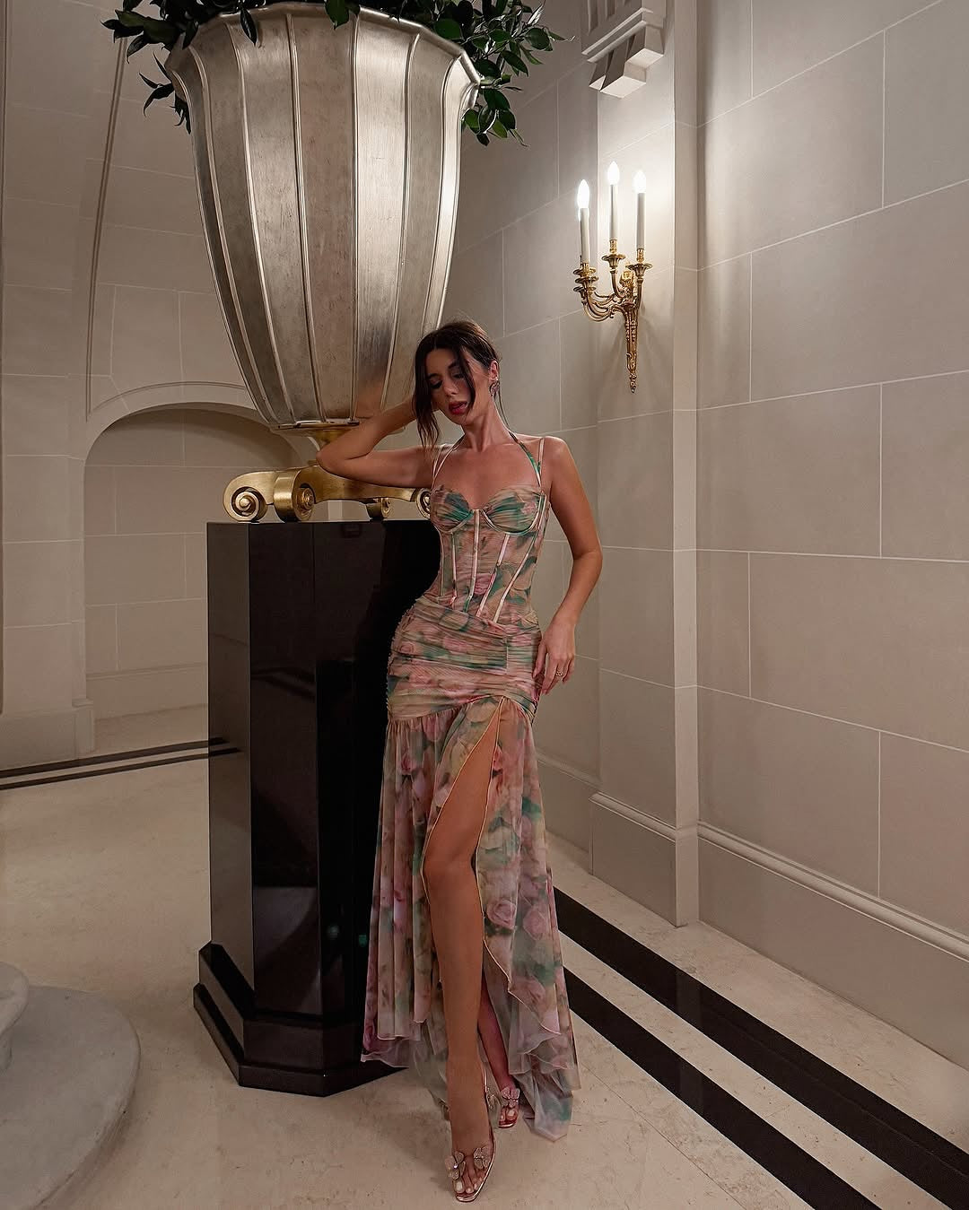 Un look care îmbină romantismul și seducția. Isamara este rochia lungă cu corset integrat care conturează silueta și atrage toate privirile. Corsetul cu bătaie evidențiază decolteul, în timp ce talia plisată și fusta asimetrică cu fante oferă mișcare și ușurință. Efectul ondulat al tivului completează look-ul cu eleganță fluidă.