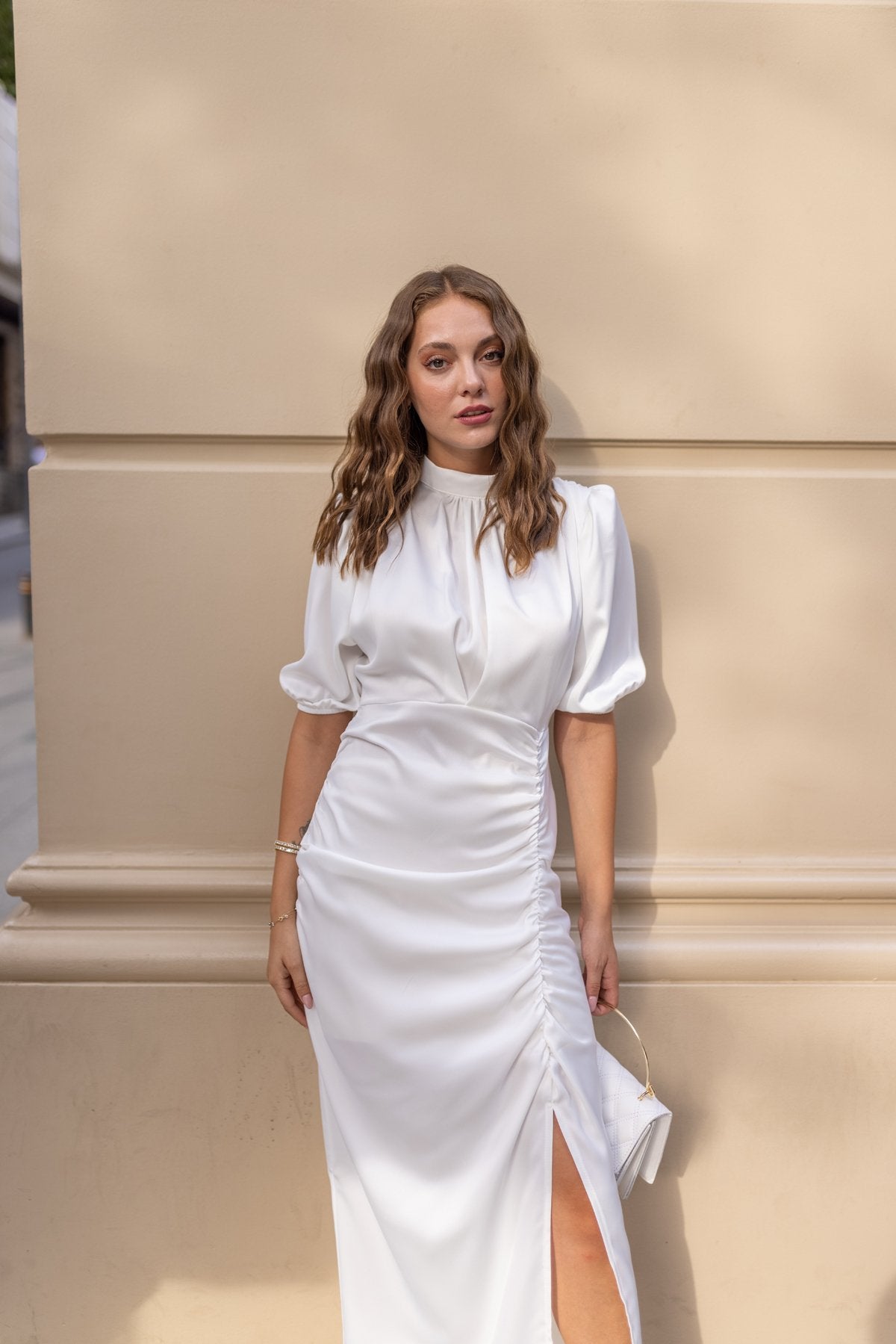 Eleganță naturală, confort absolut — Liora este rochia midi albă din bumbac care combină simplitatea rafinată cu feminitatea asumată. Croiala sa fluidă, evidențiată de o pliu delicat și o fante subtilă, oferă un echilibru perfect între relaxare și senzualitate. Ideală de dimineața până seara, în funcție de cum o accesorizezi.